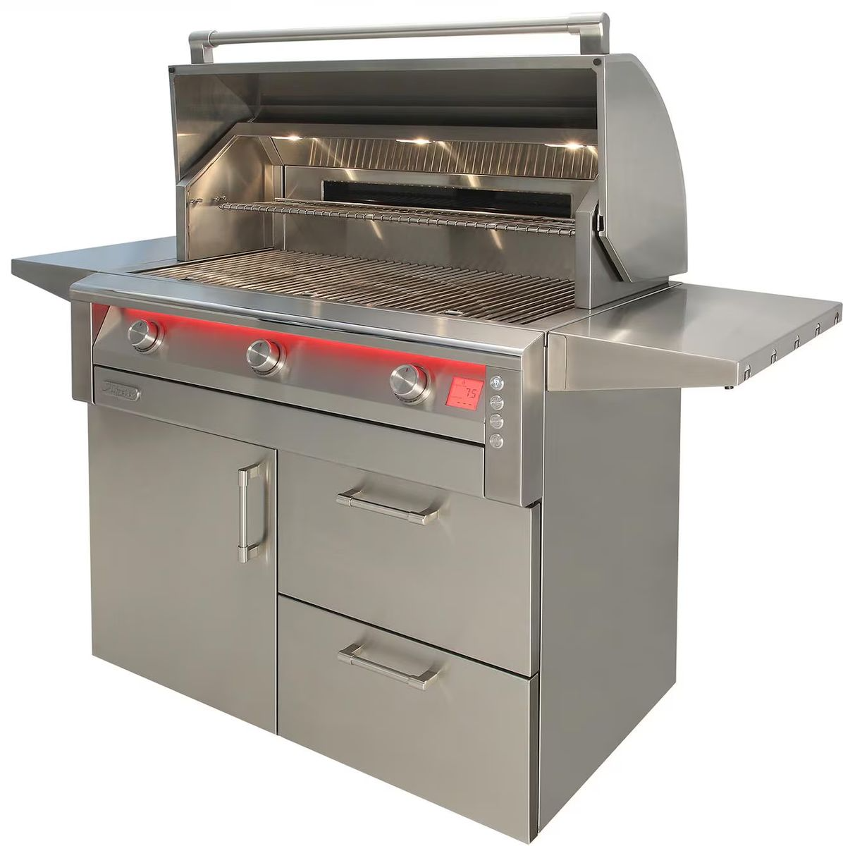 The AIPG grill puts precision and control at your fingertips with an advanced trio of smart features designed for the serious outdoor chef. The Intelli-Temp™ Smart Grilling System connects via Bluetooth® to a custom smartphone app, giving you real-time insights and allowing you to set timers, and save custom protein presets with ease. A digital backlit temperature display, located on the right corner of the control panel, provides up-to-the-second readings across all three burner zones and the wireless probe—so you always know exactly what’s happening under the hood. Completing the experience is the LumaTouch™ Control Lighting System, which illuminates each knob and the full panel with over 20 color options and 8 brightness levels, allowing you to cook in style and comfort, day or night. Notably, the knob lighting dynamically reflects burner heat intensity, providing an intuitive visual cue for precise heat management. Illuminate your grilling surface with precision using Alfresco’s Triple Halogen Grill Surface Lighting. Strategically positioned, these three high-intensity halogen lights cast a bright, even glow across the entire cooking area, ensuring you can monitor every detail of your meal with clarity. Whether you’re searing steaks or grilling vegetables, this advanced lighting system enhances visibility, allowing for perfect results every time.