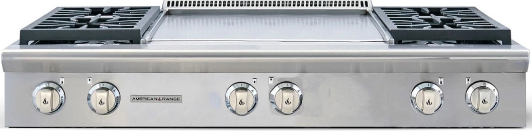 Continuous and flush commercial-grade cast iron grates allow for easy transfer of pots and pans across the cooking surface.