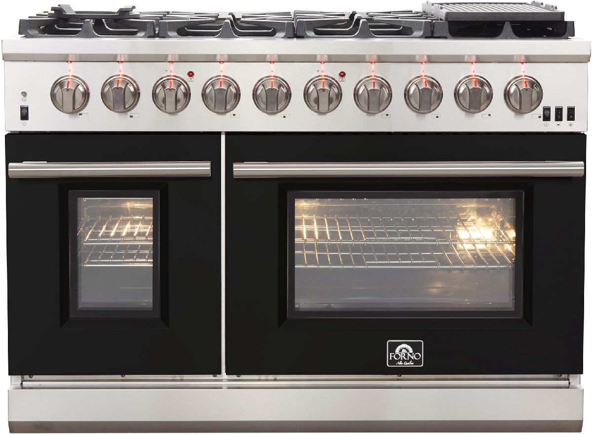 The Forno Capriasca 48 Inch Gas Range enhances your home kitchen with professional styling and performance through its durable and beautiful 304-grade stainless-steel design. The cooking surface features 8 sealed dual-ring brass burners, totaling 160,000 BTU. All burners, each at 20,000 BTU, can simmer precisely at 1,000 BTU. Continuous heavy-duty cast-iron grates facilitate easy sliding of pots or pans off heat over the enamel cooktop cavity, simplifying spill cleanup. The cumulative 6.58 cu. ft. double ovens, with a 44,000 BTU output, are enclosed in a blue enamel interior. The 4.32 cu. ft. main oven offers a powerful infrared mesh broiler, a rotisserie skewer and a convection fan for precise, and consistent cooking on multiple levels. The package includes 6 telescopic stainless-steel oven racks, 1 rotisserie kit, wok support, griddle and an LP conversion kit. Additionally, zinc-coated illuminated metal knobs with bezel rings ensure enduring beauty.Read More