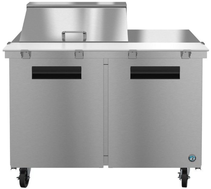 The SR48B-12M is constructed of stainless steel, which protects this unit from accidental damage and rust. Plus, it is easy to clean. The SR48B-12M also includes (2) epoxy coated wire shelves adjustable in 1/2″ increments on anodized aluminum supports, (4) 6″ stem casters (2 with brakes) are standard, plus a field reversible, spring assisted self closing door with stay open feature (no kit req’d). Electrical consumption of 2.83 kWh/day at 3 Amps, 10 ft long cord with a 5 – 15P NEMA plug. 48″ x 10″ x 0.5″ thick white polyethylene cutting board is standard. The unit is ETL Safety (US & C) Listed, ETL Sanitation, Georgia Made Certified and includes a 7-7-7 Warranty (seven years labor, seven years parts, seven years compressor — visit hoshizakiamerica.com/support/warranty for eligibility information).