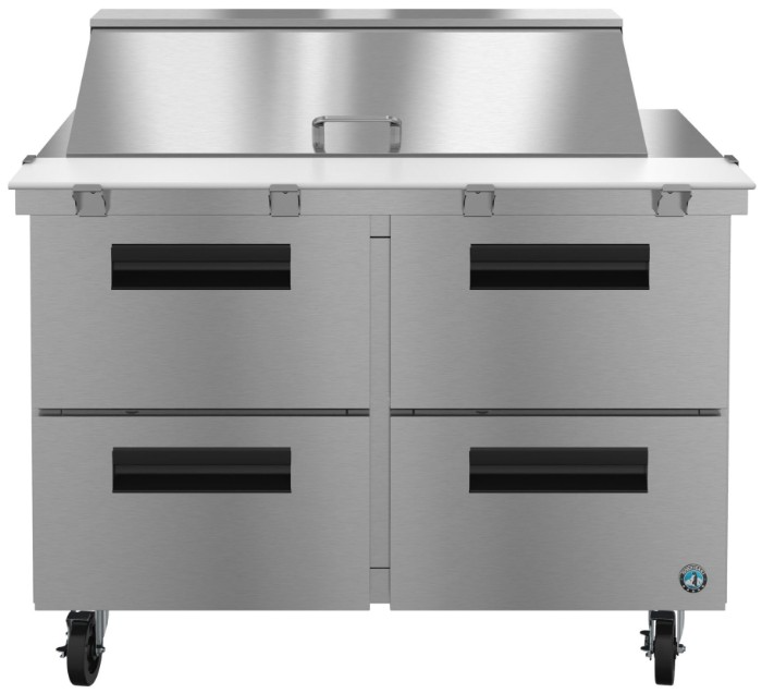 The SR48B-18MD4 is constructed of stainless steel, which protects this unit from accidental damage and rust. Plus, it is easy to clean. The SR48B-18MD4 also includes Drawers capacity: Top: (1) 1/2 size and (1) 1/3 size pans, 4″ deep. Bottom: (1) 1/2 size and (1) 1/3 size, 6″ deep pans (pans by others), (4) 6″ stem casters (2 with brakes) are standard, plus a the drawer slides are constructed of 16 gauge stainless steel with durable acetal rollers. Electrical consumption of 2.83 kWh/day at 3 Amps, 10 ft long cord with a 5 – 15P NEMA plug. 48″ x 10″ x 0.5″ thick white polyethylene cutting board is standard. The unit is ETL Safety (US & C) Listed, ETL Sanitation, Georgia Made Certified and includes a 7-7-7 Warranty (seven years labor, seven years parts, seven years compressor — visit hoshizakiamerica.com/support/warranty for eligibility information).