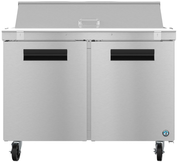 The SR48B-12 is constructed of stainless steel, which protects this unit from accidental damage and rust. Plus, it is easy to clean. The SR48B-12 also includes (2) epoxy coated wire shelves adjustable in 1/2″ increments on anodized aluminum supports, (4) 6″ stem casters (2 with brakes) are standard, plus a field reversible, spring assisted self closing door with stay open feature (no kit req’d). Electrical consumption of 2.38 kWh/day at 3 Amps, 10 ft long cord with a 5 – 15P NEMA plug. 48″ x 10″ x 0.5″ thick white polyethylene cutting board is standard. The unit is ETL Safety (US & C) Listed, ETL Sanitation, Georgia Made Certified and includes a 7-7-7 Warranty (seven years labor, seven years parts, seven years compressor — visit hoshizakiamerica.com/support/warranty for eligibility information).