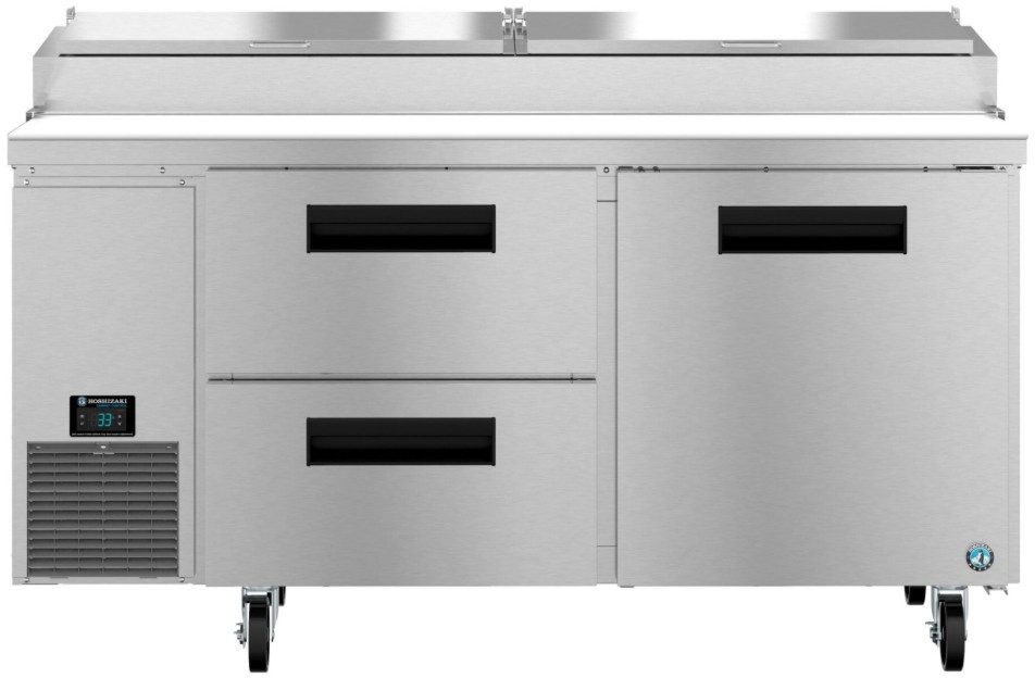 It features a dual controller system for ideal temperatures in both the rail and cabinet. The PR67B-D2 is constructed of stainless steel, which protects this unit from minor damage and rust. Plus, it is easy to clean. The PR67B-D2 includes (9) polycarbonate plastic 1/3rd size pans, 4″ deep. drawer/door units are made to order. allow 4-6 weeks. Equipped with drawer slides constructed of 14 gauge stainless steel with durable delrin rollers. A 67″ x 19″ x 0.5″ thick white polyethylene cutting board is standard. Refrigerant flow is controlled with a capillary tube. The unit is ETL Safety (US & C) Listed, ETL Sanitation, Georgia Made Certified and includes a 7-7-7 Warranty (seven years labor, seven years parts, seven years compressor — visit hoshizakiamerica.com/support/warranty for eligibility information).