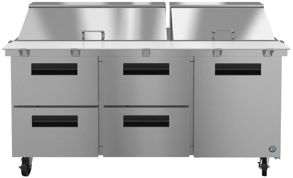 The SR72B-30MD4 is constructed of stainless steel, which protects this unit from accidental damage and rust. Plus, it is easy to clean. The SR72B-30MD4 also includes (1) epoxy coated wire shelves and (4) stainless steel drawers each with (1) divider bar, (4) 6″ stem casters (2 with brakes) are standard, plus a the drawer slides are constructed of 16 gauge stainless steel with durable acetal rollers. Electrical consumption of 5.05 kWh/day at 4 Amps, 10 ft long cord with a 5 – 15P NEMA plug. 72″ x 10″ x 0.5″ thick white polyethylene cutting board is standard. The unit is ETL Safety (US & C) Listed, ETL Sanitation, Georgia Made Certified and includes a 7-7-7 Warranty (seven years labor, seven years parts, seven years compressor — visit hoshizakiamerica.com/support/warranty for eligibility information).