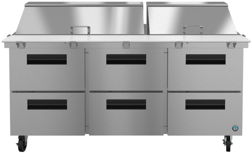 The SR72B-30MD6 is constructed of stainless steel, which protects this unit from accidental damage and rust. Plus, it is easy to clean. The SR72B-30MD6 also includes Drawers capacity: Top: (1) 1/2 size and (1) 1/3 size pans, 4″ deep. Bottom: (1) 1/2 size and (1) 1/3 size, 6″ deep pans (pans by others), (4) 6″ stem casters (2 with brakes) are standard, plus a the drawer slides are constructed of 16 gauge stainless steel with durable acetal rollers. Electrical consumption of 5.05 kWh/day at 4 Amps, 10 ft long cord with a 5 – 15P NEMA plug. 72″ x 10″ x 0.5″ thick white polyethylene cutting board is standard. The unit is ETL Safety (US & C) Listed, ETL Sanitation, Georgia Made Certified and includes a 7-7-7 Warranty (seven years labor, seven years parts, seven years compressor — visit hoshizakiamerica.com/support/warranty for eligibility information).
