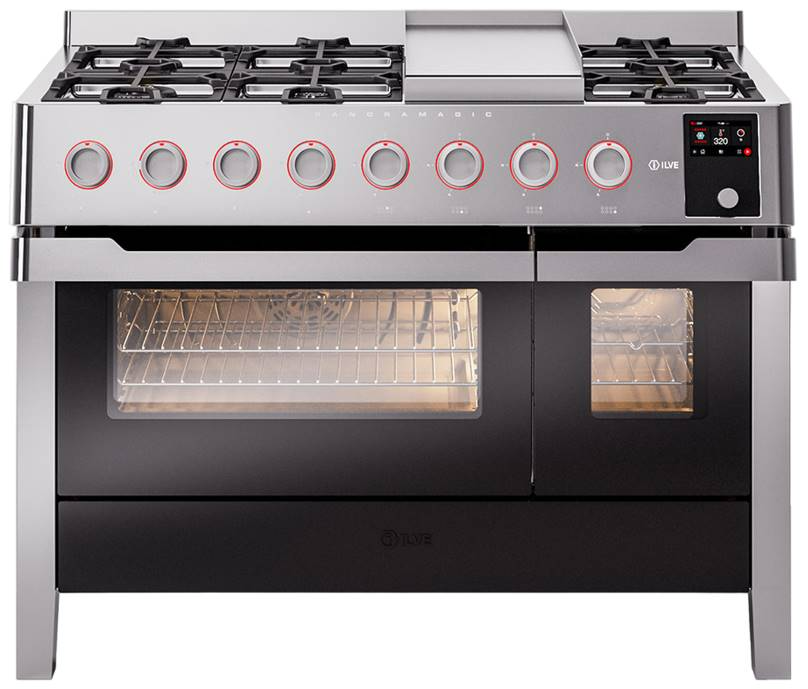 Unique design that combines the technical features of professional kitchens with the Italian culture of design, Panoramagic range cookers come in three models, all with a 4.3-inch touch screen: 48 inch with double oven and precise temperature control, 36 inches with 6 burners or with induction cooktop (hob) with 6 zones. The gas cooktops (hobs) use dual burners up to 20000 BTU as standard and a highly professional nanotechnological treatment to achieve a non-stick surface with a total black finish.