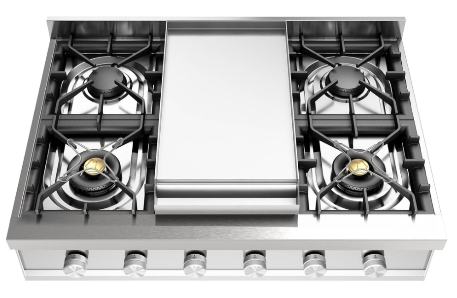 The Professional Plus II 36" rangetop features 4 burners and griddle, designed for both style and functionality in stainless steel. It includes heavy cast iron pan grates for durability and stability while cooking. The cooktop is equipped with Total Black brass burners that feature a non-stick nanotechnological coating, ensuring easy maintenance and enhancedRead More