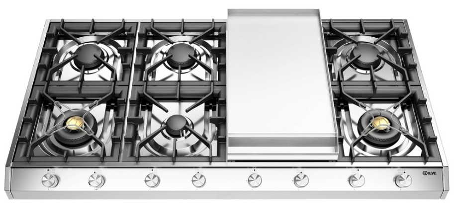 The 48" built-in gas cooktop features 6 burners and griddle, designed for both style and functionality in stainless steel. It includes heavy cast iron pan grates for durability and stability while cooking. The cooktop is equipped with Total Black brass burners that feature a non-stick nanotechnological coating, ensuring easy maintenance and enhanced cooking performance.Read More